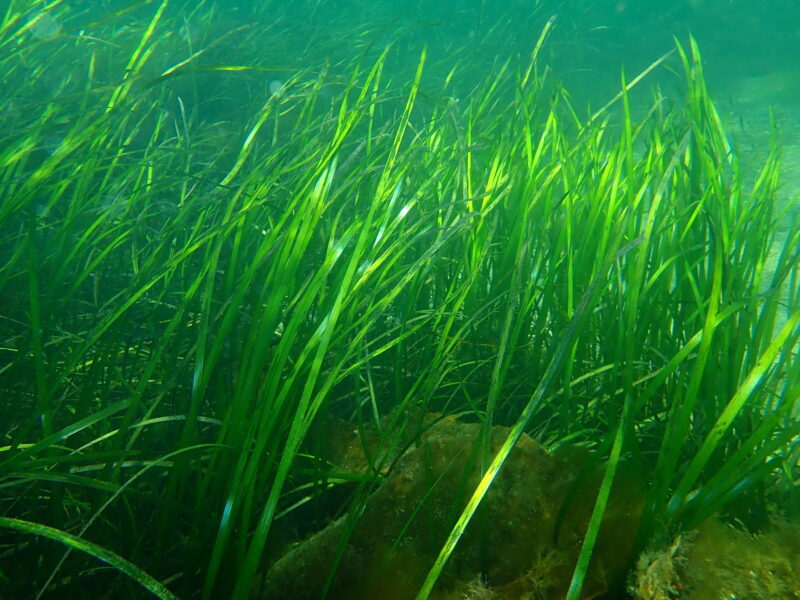 Eelgrass are phanerogams (i.e. flowering plant) plants living in brackish and marine environments, building underwater beds near the surface, looking like an underwater version of earthbound meadows. In the North Atlantic, the beds are formed by two species: Zostera marina (15 to 120 cm) and Zostera noltei (5 to 45 cm). Eelgrass beds are an important coastal ecosystem because they stabilize the substratum and reduce erosion. A high diversity of animal and vegetal species is living in these environments, especially macroalgal epiphytes, which are organisms using the surface of others as a substrate; and macroalgal benthic species, which are observable with the naked eye and live on the sediment protected by eelgrass.