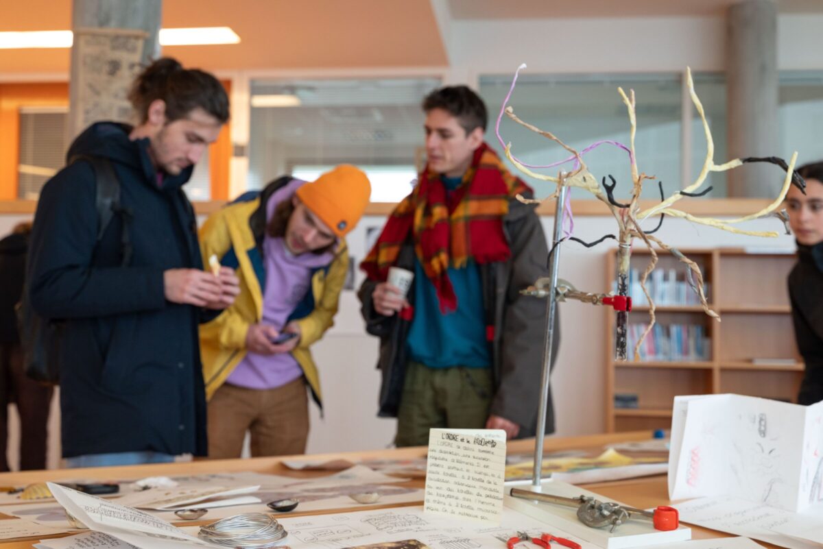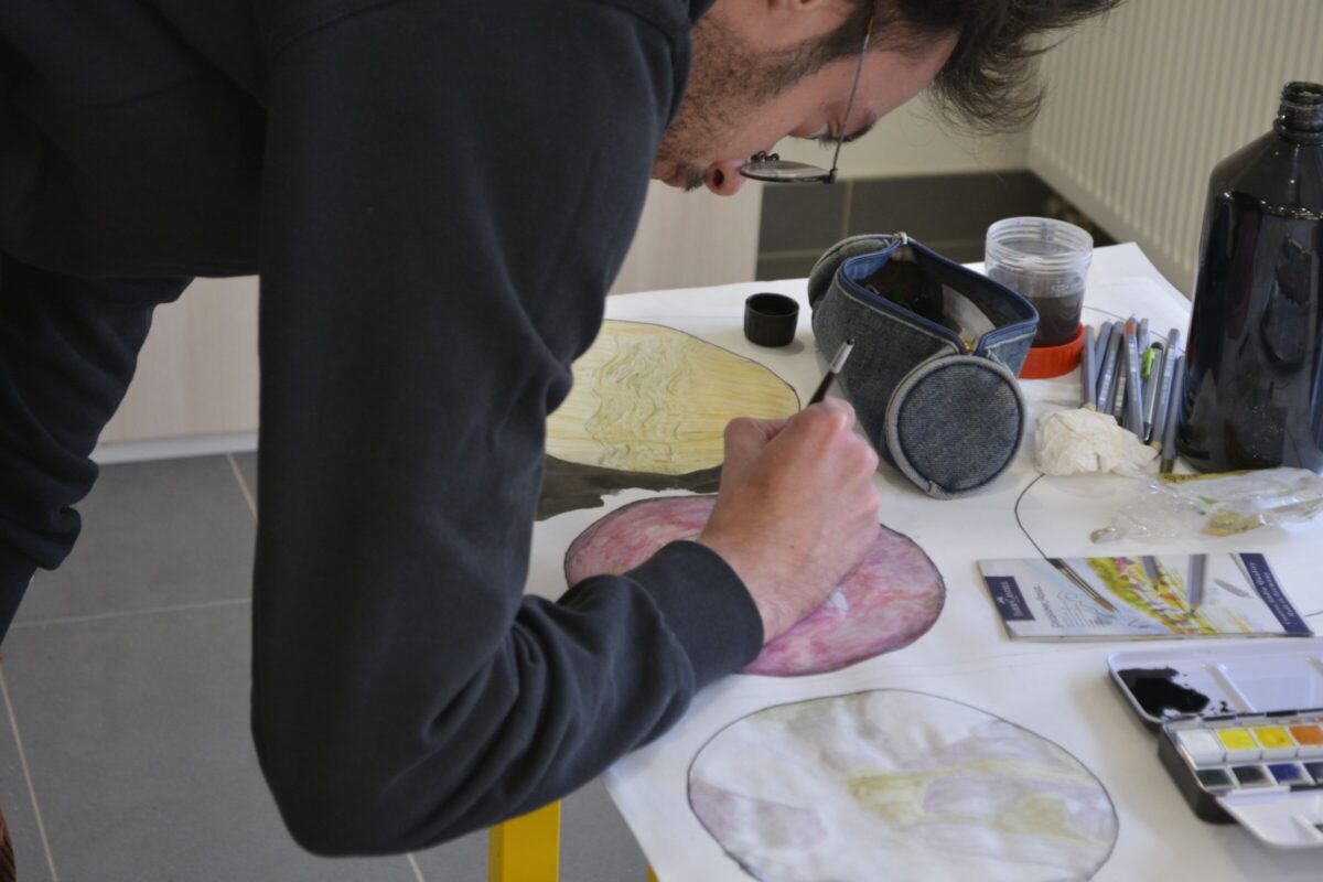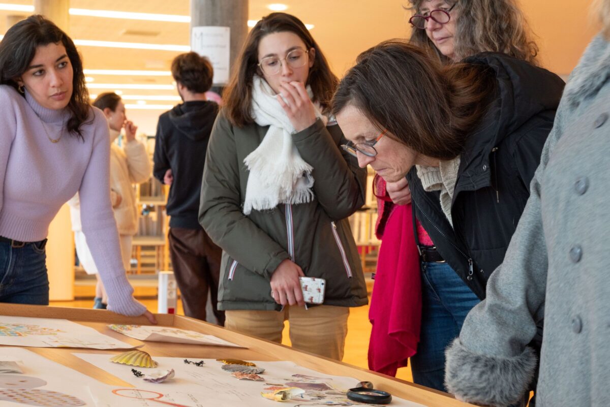 Après avoir prélevé des échantillons biologiques sur le terrain et les avoir observés en laboratoire, les étudiant·es ont réalisé des expérimentations plastiques et graphiques qui devaient les mener collectivement à la construction d’une exposition. Leur « enquête » artistique et leurs réflexions sur cette approche Arts & Sciences ont été alimentées toute la semaine par des échanges avec différents chercheurs ISblue.