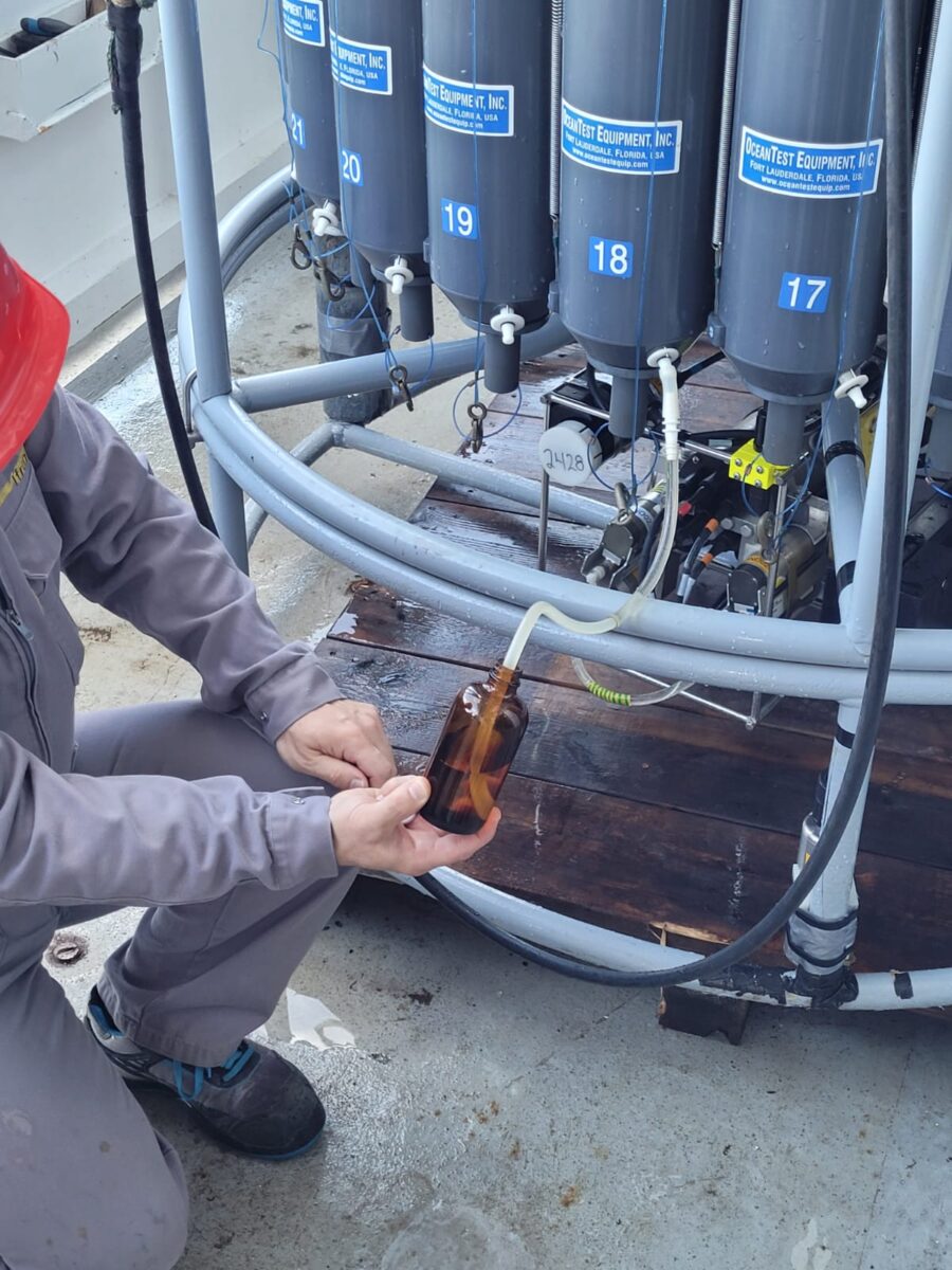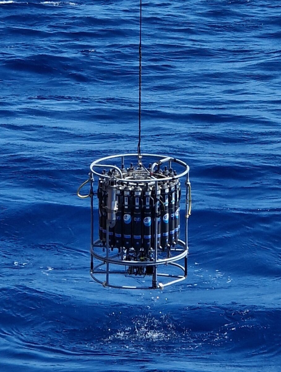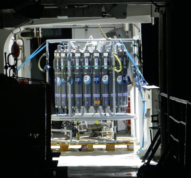 Les prélèvements d’eau permettent la collecte d’échantillons qui pourront être analysés en laboratoire. Ils se font à l’aide de bouteilles Niskin (Photo 4) qui sont « claquées » à différentes profondeurs grâce au moteur de Rosette. Pour la campagne, l’objectif est d’obtenir des profils de gaz (dioxyde de carbone, méthane, hydrogène), d’alcalinité, de pH, de CID (Carbone Inorganique Dissous) et de silicium. D’autres échantillons sont également prélevés pour l’analyse de cations, anions, lithium, hélium, chacun dans des contenants adaptés. La collecte du silicium permet ensuite la vérification de la qualité des échantillons et la détection d’éventuelles contaminations dans le cas où les bouteilles auraient été mal fermées ou présenteraient des problèmes d’étanchéité.
