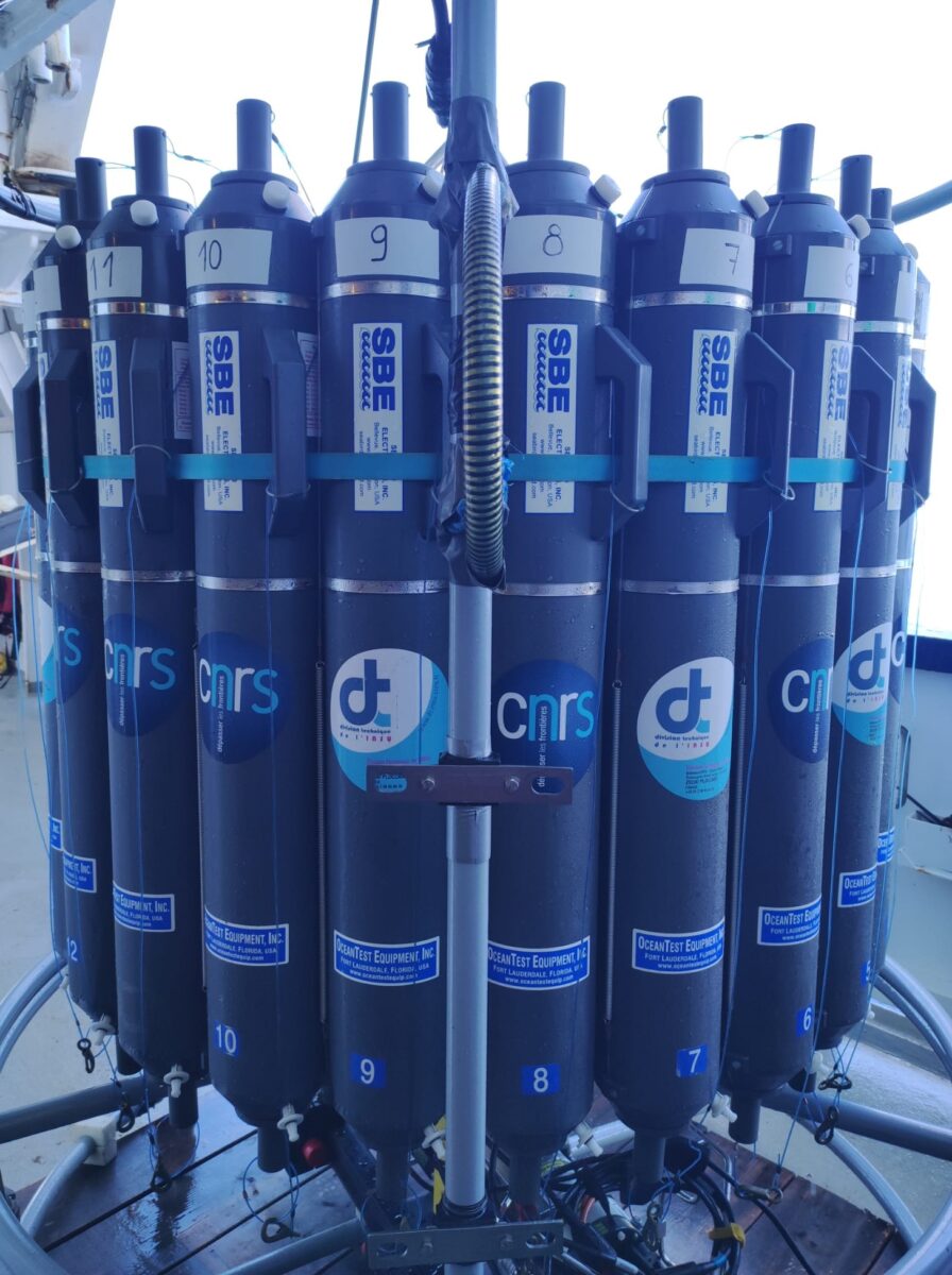 Les rosettes utilisées en campagne hauturière peuvent mesurer 2 m de haut et 1,50 m de diamètre (Photo 1) et peuvent descendre jusqu’à 6000 m de profondeur grâce à un câble.
