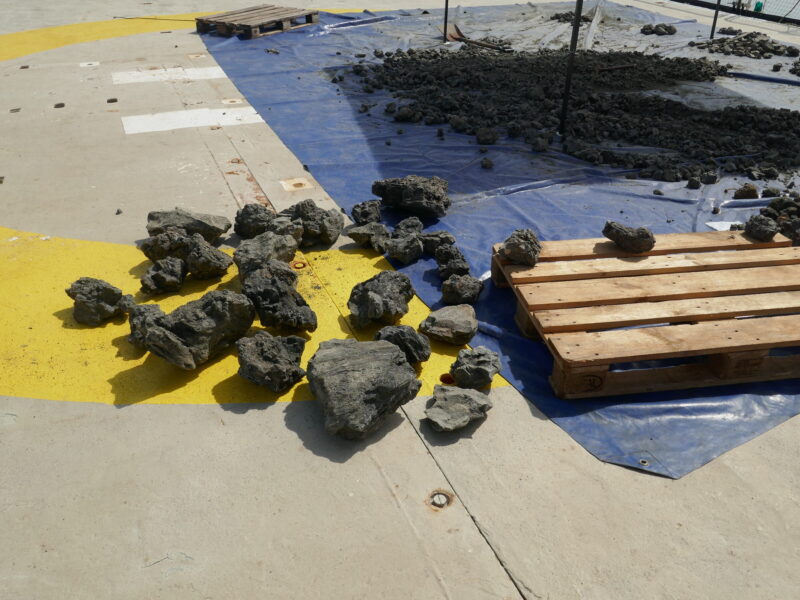 Le travail ne fait que commencer pour l’équipe : il faut maintenant trier l’ensemble des échantillons, pour commencer à donner quelques indications sur le type de roches qui ont été prélevées. Toutes ne peuvent pas être gardées, il faut donc également les séparer (Figure 8). Le contenu de la drague est renversée sur la « DZ » (plateforme arrière supérieure) pour que cette opération commence. Le tri de la DR-47 a duré assez longtemps, et s’est fait en plusieurs étapes, en raison de la très grande quantité de roches.