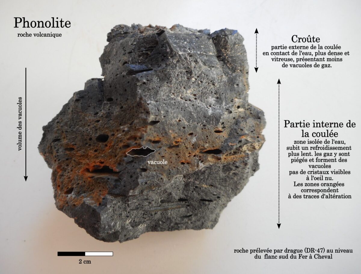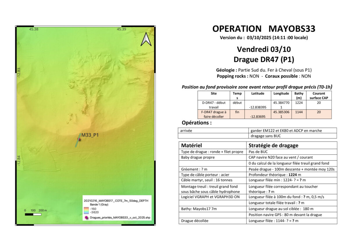 En amont de l’opération, une préparation très précise est nécessaire. Il faut d’abord faire des choix sur les sites qui vont être échantillonnés, en fonction de leur intérêt en termes de nature ou âge des roches, mais aussi par rapport à la bathymétrie du fond, pour que celle-ci soit propice à la réalisation de l’opération. Un profil bathymétrique est réalisé en amont pour déterminer tous ces paramètres. Les eaux mahoraises étant particulièrement protégées, il y a une limite imposée de longueur de dragage sur le fond, qui est de 180 m. L’opération présentée ici est la DR-47 (Figure 2), effectuée le 3 octobre sur le flanc externe sud du cône pyroclastique du Fer à Cheval.