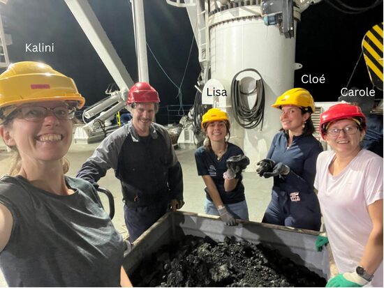 Figure 1. La « Team dragage », après une troisième drague réussie. De gauche à droite: Kalini, Jean-Christophe (chef de mission principal), Lisa, Chloé et Carole. © Kalini