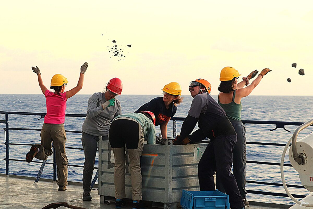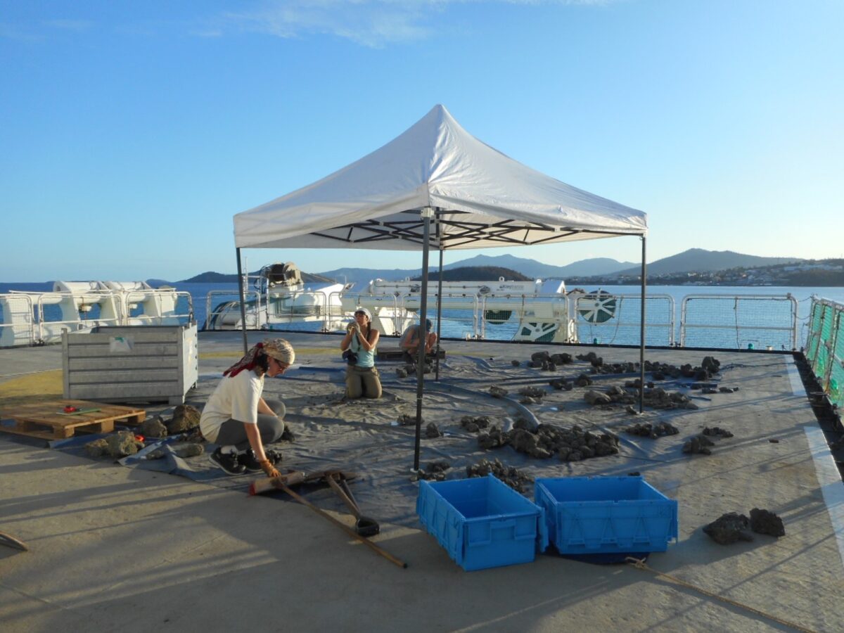 Le travail ne fait que commencer pour l’équipe : il faut maintenant trier l’ensemble des échantillons, pour commencer à donner quelques indications sur le type de roches qui ont été prélevées. Toutes ne peuvent pas être gardées, il faut donc également les séparer (Figure 8). Le contenu de la drague est renversée sur la « DZ » (plateforme arrière supérieure) pour que cette opération commence. Le tri de la DR-47 a duré assez longtemps, et s’est fait en plusieurs étapes, en raison de la très grande quantité de roches.