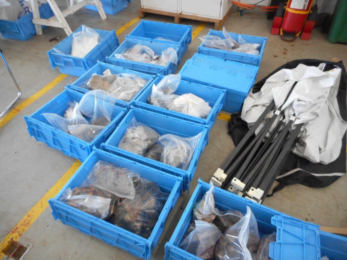 Les échantillons choisis sont soigneusement décrits par l’équipe de drague (Figure 12), qui les emballe dans de la cellophane si besoin, et les met dans des sacs plastiques numérotés. Tout est ensuite rangé dans des boîtes qui seront envoyées par bateau vers l’Hexagone (Figure 13).