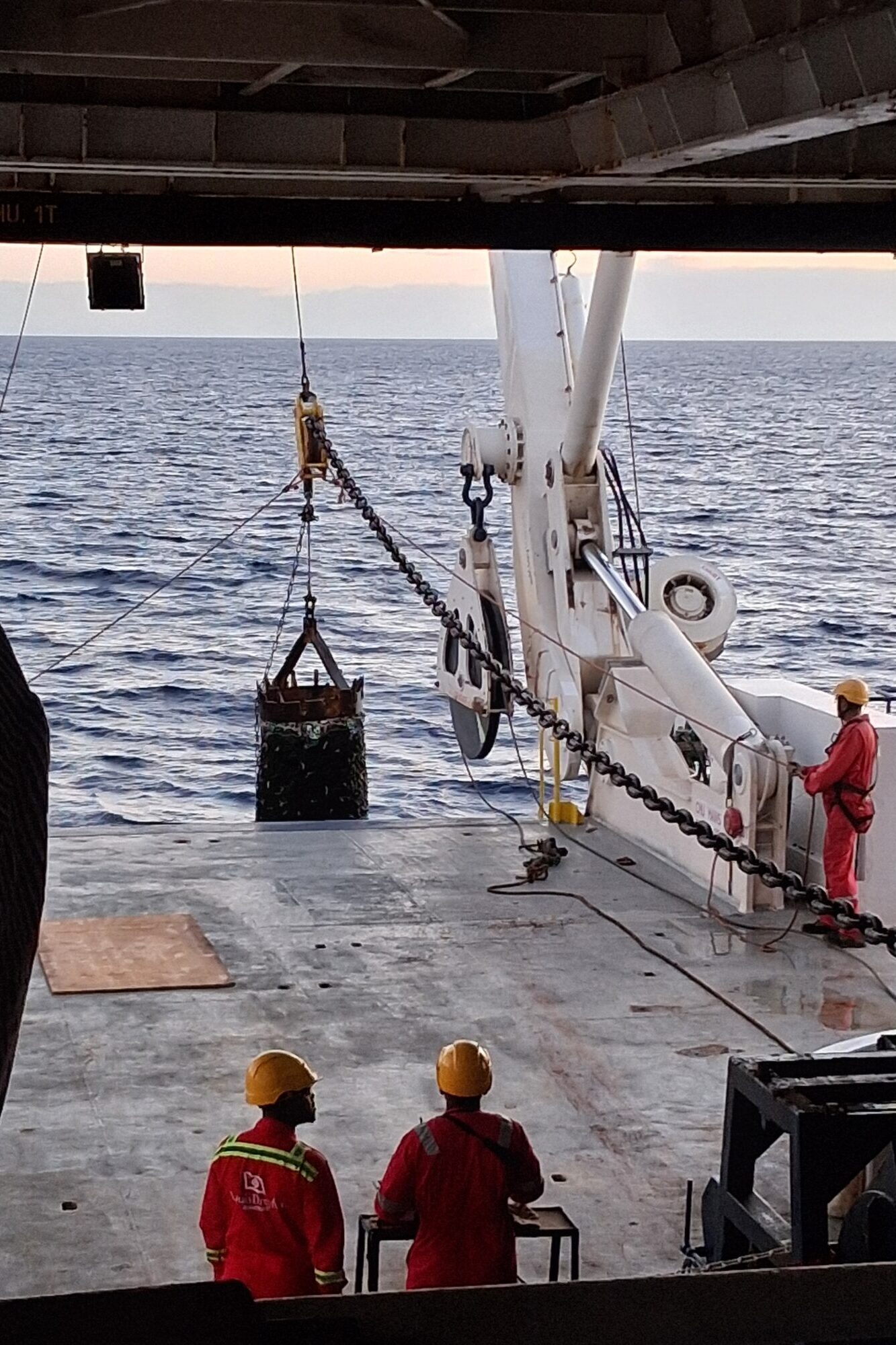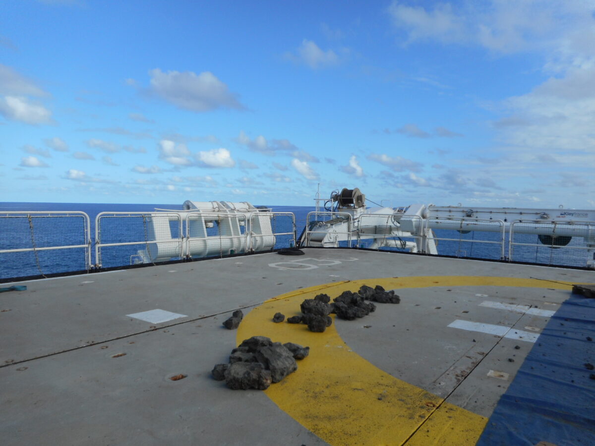 Une fois le profil complété, la drague est virée (c’est-à-dire remontée). L’indication est donnée par l’équipe au PC-Science, qui vérifie l’emplacement de celle-ci au fur et à mesure à la main. La remontée commence, elle dure plusieurs dizaines de minutes. Tout le monde est encore très attentif pour contrôler la vitesse de remontée du train de drague. Une pesée est aussi effectuée, permettant d’estimer la quantité de roches prélevées. L’équipage sur le pont reprend les commandes du virage pour la fin de la remontée. Tout le monde se rend alors sur le pont ou sur l’héliport pour le meilleur moment de l’opération (Figure 7): les derniers mètres de câble, et enfin, la drague !