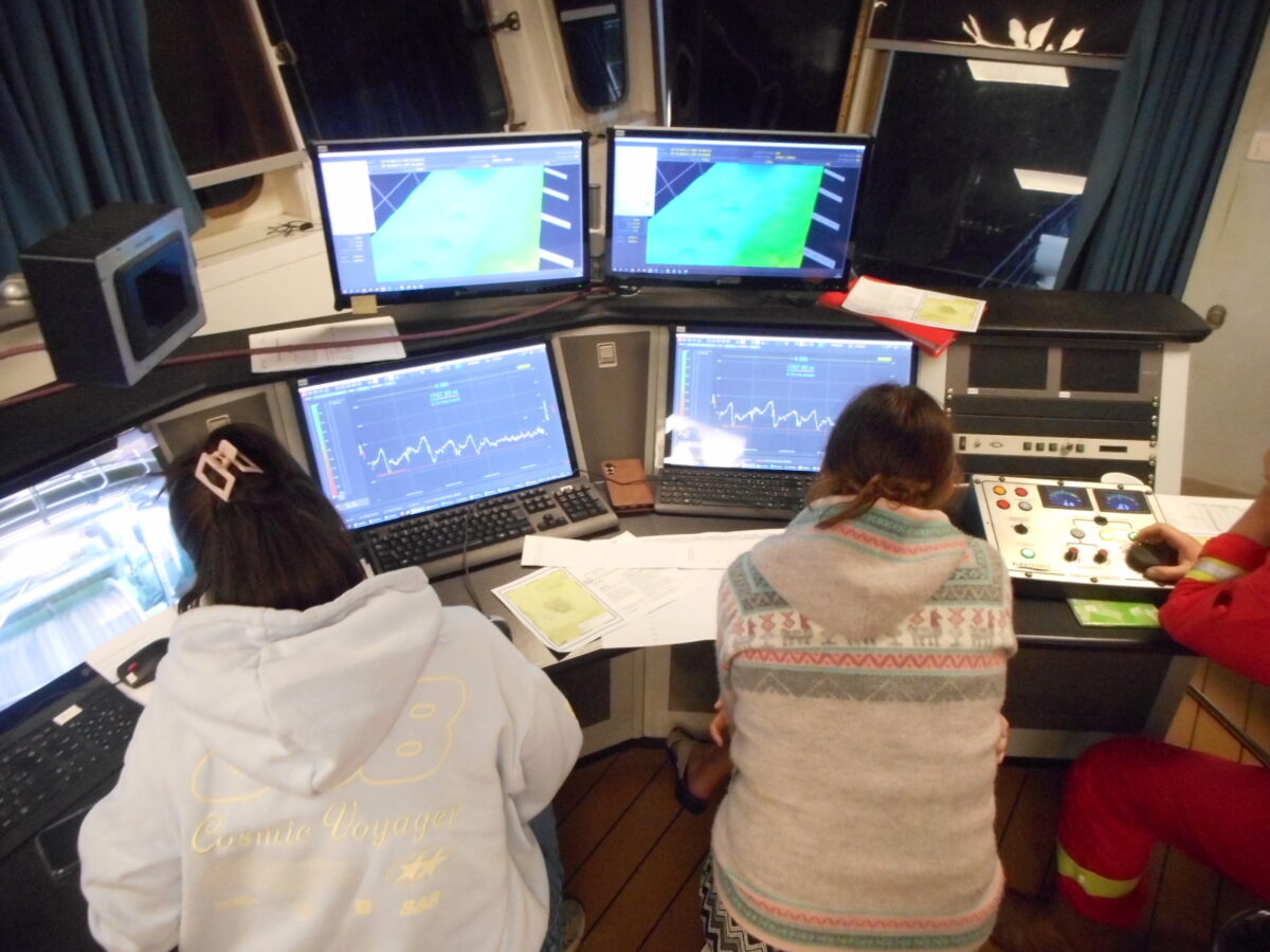 Figure 6. Les opérations depuis le PC-Science – Cloé et Carole suivent l’évolution de la tension du câble sur les écrans pour repérer les croches. © Raphaëlle