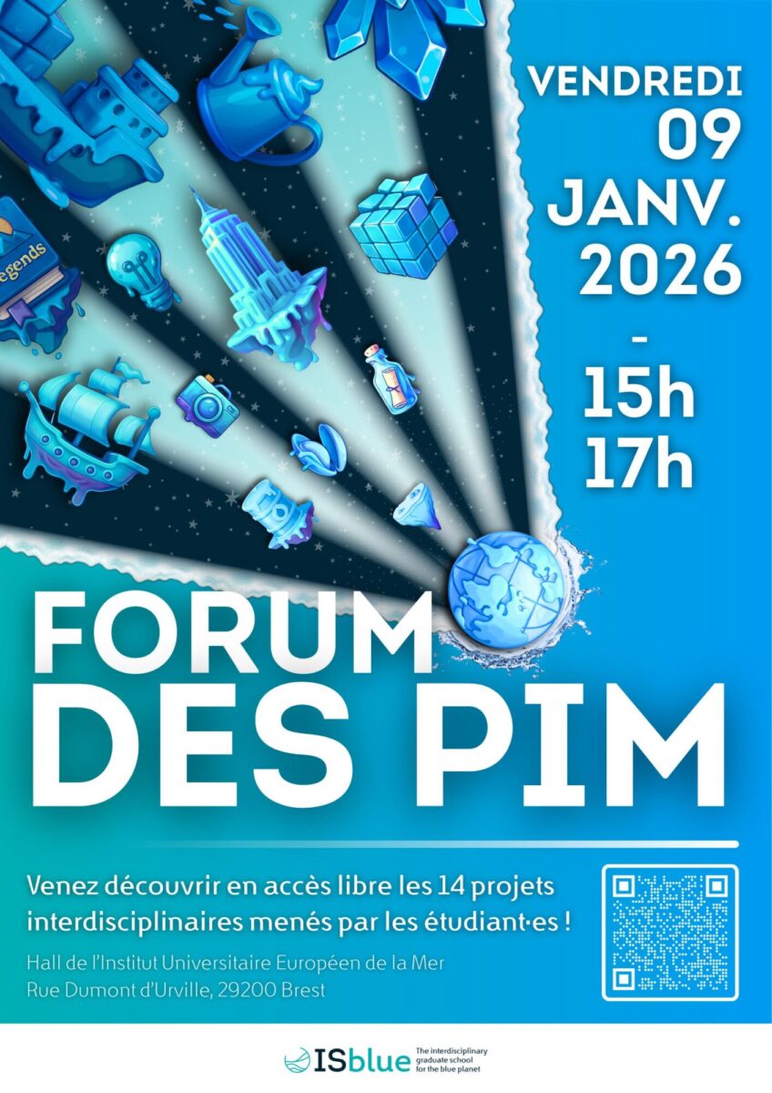 Le forum de présentation des PIM ou Projets Interdisciplinaires Mutualisés se tiendra le vendredi 09 janvier 2025 de 15h à 17h à l’Institut Universitaire Européen de la Mer (Technopole, Plouzané) pendant lequel chaque PIM aura son stand.