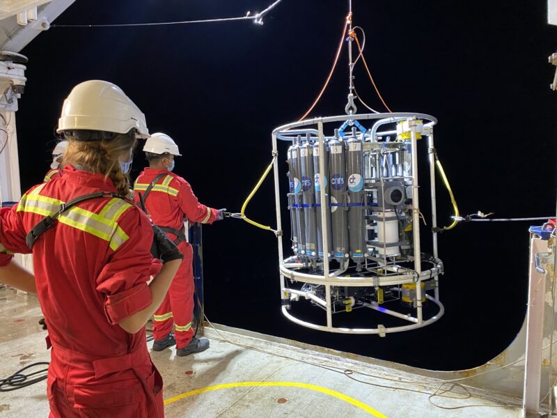 The rosette and all the sensors installed on it (including the famous CTD) allow us, as at each station, to obtain information on the properties of the water masses (temperature, salinity, fluorescence, oxygen, turbidity, current velocities) over the entire water column, as well as to sample water at different depths. The 19 bottles are closed during the ascent to depths chosen according to the measurements made during the descent. The water in the bottles is then distributed among the teams on board.