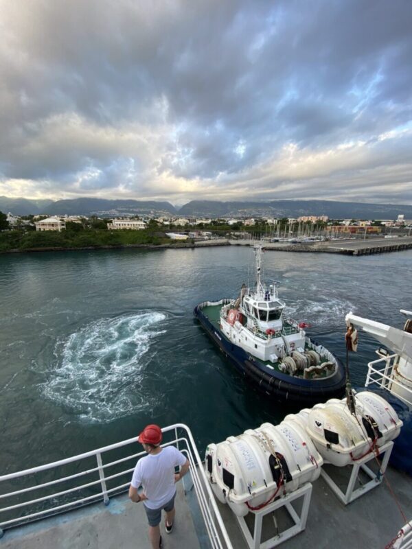 Early in the morning, Reunion Island greeted us with a hot humid weather and sunshine after several hours of flight from the different parts of France and South Africa. We were picked up by a bus that dropped us off directly at “Le Port“ where the ship “Marion Dufresne“ was moored. The preparations, such as the boarding of scientific instruments (and food) had already been going on for the past couple of days. After all, during the next 5 weeks, there will be no more opportunities to pick up anything that might have been forgotten.