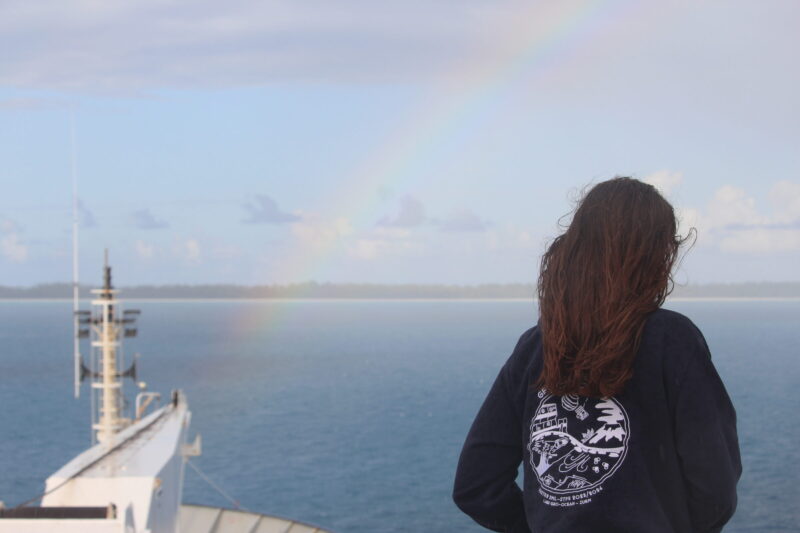 Après toutes ces émotions, le mercredi 12 au matin a été marqué par le passage du navire au plus proche de l’atoll de Bassas da India à l’aube pendant les acquisitions sismiques. A 7h du matin, l’équipe scientifique s’est ainsi donné rendez-vous sur la passerelle supérieure afin d’admirer le spectacle. Progressivement, nous apercevons au loin d’abord les vagues qui déferlent sur les hauts fonds, puis commence à se dessiner un grand halo bleu, perdu au milieu de l’océan. Malgré une mer agitée et la marée haute, nous étions très heureux de pouvoir observer ce spectacle, et ses nuances de bleu turquoise au bleu marine.