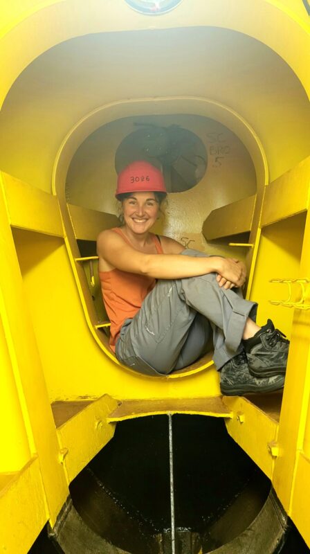 Le clou du spectacle en cette fin de journée, imaginez descendre 5 échelles verticales (5 niveaux) à l’avant du navire. Nous arrivons dans un espace étriqué, allongé et arrondis. Et oui, tour à tour, nous voilà dans le bulbe d’étrave, autrement dit le Brion (Fig. 12 et 13). Cette zone fortement consolidée, pouvant accueillir très peu de personnes permet même d’aller échantillonner des eaux non perturbées par le passage du navire. Dans cette pièce si particulière, rendue à ~ 6 mètres sous le niveau de la mer, nous pouvons ressentir la force de l’eau contre la coque.