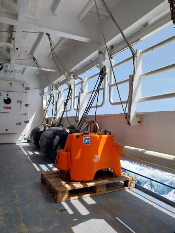 Lors du deuxième leg, le déploiement des OBS sert un objectif différent. Beaucoup plus grands en taille, les sismomètres de fond de mer K.U.M. peuvent rester environ un an sur le fond océanique pour enregistrer les tremblements de terre se produisant dans la région. Aucune source active ne sera utilisée: seules les ondes provenant de séismes proches ou lointains seront enregistrées, permettant de détecter et localiser la sismicité locale et régionale et d’obtenir une tomographie sismique. Une batterie solide et une carte mémoire de 256 Go permettent un enregistrement continu sur de longues périodes (jusqu’à 3 ans) à des profondeurs significatives (jusqu’à 6000 m). Les capteurs offrent une large gamme possible d’options de détection, du géophone “classique” à 4,5 Hz (haute fréquence, pour séismes proches) à un spectre “large bande” à 120 secondes (basse fréquence, pour téléséismes).