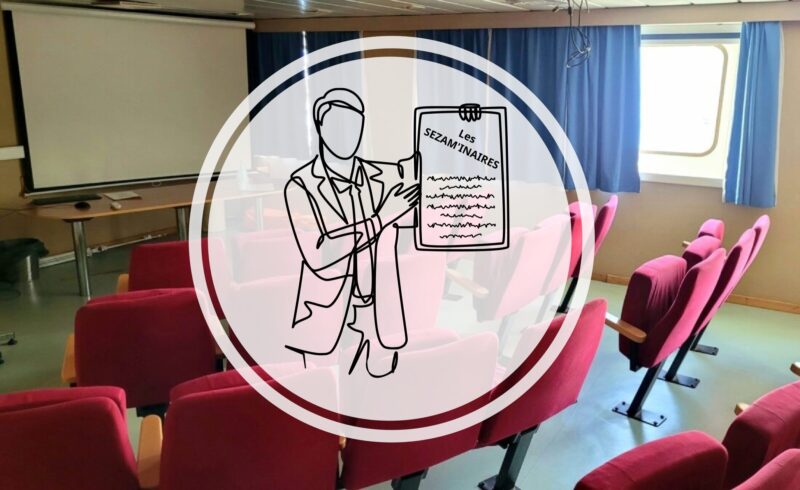 Afin de mieux faire circuler les connaissances, nous organisons des séminaires à bord de la mission SEZAM, les « SEZAM’INAIRES ». Ces évènements ouverts à tous, contribuent à la vie à bord en créant des moments d’échanges, et au partage de connaissances entre scientifiques et/ou avec l’équipage. Ils ont lieu régulièrement dans la salle de conférence du Marion Dufresne (pont F !)