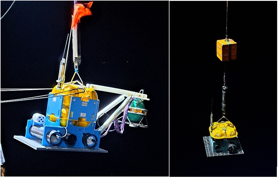 Figure 1. Les deux types d’OBS utilisés pendant la campagne MAYOBS33 : BB-OBS (gauche) et SP-OBS (droite) lors de mises à l’eau. La partie jaune est le flotteur. © Campagne MAYOBS33