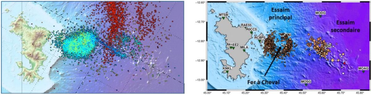 Dans le cadre de la surveillance du risque sismique au large de Mayotte, le déploiement d’OBS est déterminant pour étudier la distribution et l’évolution spatio-temporelle des séismes. En effet, la mise en place de plusieurs OBS sur le fond de mer a permis de mieux contraindre les séismes déjà enregistrés auparavant via le réseau à terre et de positionner précisément les séismes qui se sont produits depuis leur mise en place grâce à la couverture azimutale permise par ces instruments. Ces stations ont notamment permis de bien distinguer la position et la géométrie des deux essaims sismiques, l’un sous le fer à Cheval et l’autre sous le volcan Fani Maoré (Figure 2).