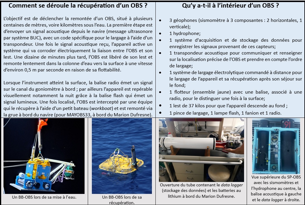 Au cours de la campagne MAYOBS33, plusieurs opérations de récupération et de (re)déploiement des OBS ont été effectuées. En tout, 3 SP-OBS (courte période) et 2 BB-OBS (large bande) faisant partie du parc de sismomètres marins du REVOSIMA (Réseau de surveillance volcanique et sismologique de Mayotte) ont été relevés. Le parc a été mis en place en mars 2019 et de nouveaux instruments ont été rajoutés au fur et à mesure. Des opérations de relève et mouillage ont lieu tous les 4 à 6 mois, pour récupérer les données, vérifier si tout fonctionne bien et changer les batteries.