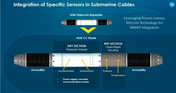 Ce projet a été le fruit de nombreuses années de conception, qui a permis de réaliser des stations spécifiques à placer sur les câbles sous-marins. Mais ce projet fut abandonné après 4 ans de recherche au profit d’un nouveau type de câble (Figure 2), fourni par les Etats-Unis, dit SMART Cable (Science Monitoring And Reliable Telecommunication). A l’intérieur, un capteur est inséré dans un « nœud » de dimensions similaires au répéteurs de câbles de télécommunication sous-marin. Ce SMART Cable se décompose en deux partie distinctes, la première dite partie sèche contenant un sismomètre et un accéléromètre et la seconde humide qui regroupe un capteur de pression absolue dit A0A et un thermomètre.