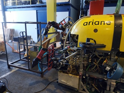 Figure 3. Le ROV Ariane manipulant un prototype lors d’un essai. © Hélène Leau