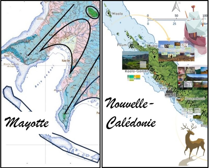 L’île de Mayotte a une histoire polyphasée (début il y a 28 millions d’années) avec une première émersion entre 10 et 4 Ma liée à l’émergence de deux volcans « boucliers » au nord et au sud (Figure 1). Ce début d’émersion de l’île est observable sur le terrain par des coulées de laves basaltiques et de hauts sommets volcaniques. Certains des dépôts volcaniques ont été intensément altérés, formant des sols « latéritiques » riches en oxydes ferromagnésiens, ce qui leur donne des couleurs ocres à rougeâtres (padza). Certains affleurements montrent une alternance entre des niveaux très sombres et ocres, ce qui montre une temporalité des laves (coulées de lave suivie de longs épisodes de forte altération différentielle puis formation de nouvelles laves au-dessus qui viennent sceller les sols en dessous).