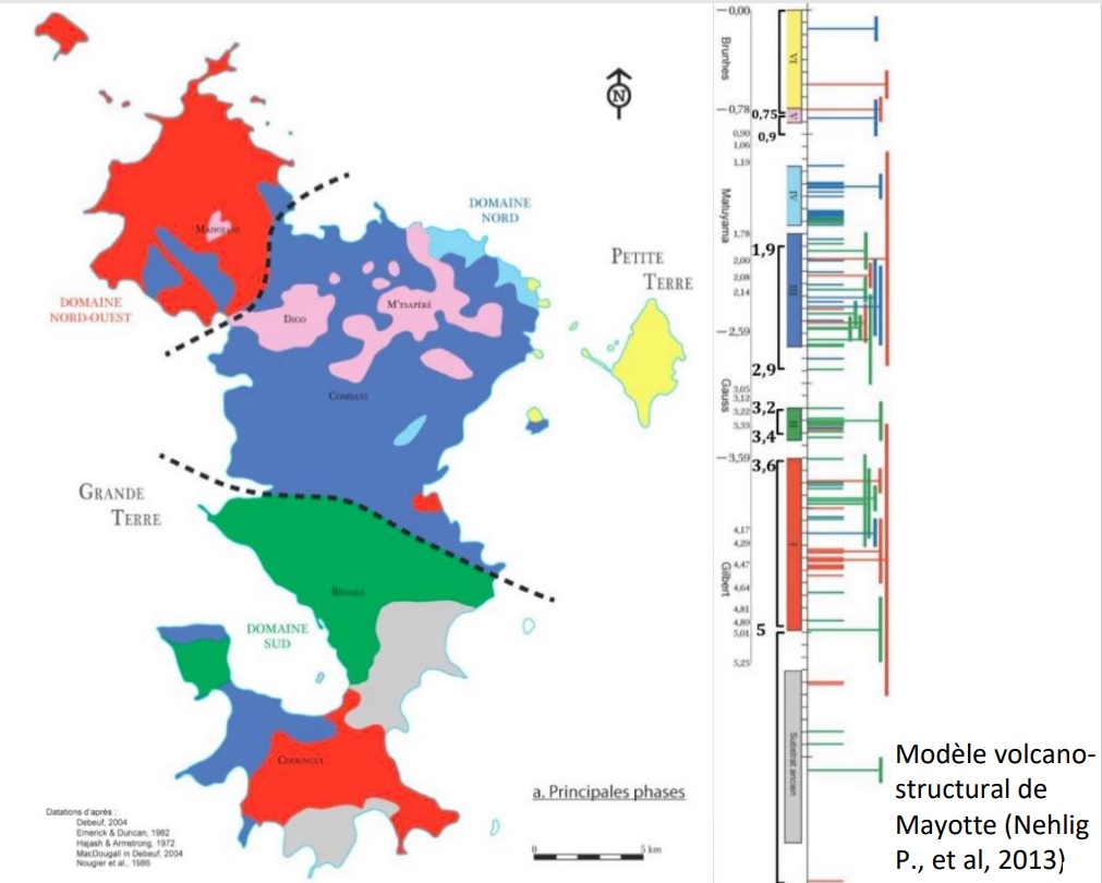 L’île de Mayotte a une histoire polyphasée (début il y a 28 millions d’années) avec une première émersion entre 10 et 4 Ma liée à l’émergence de deux volcans « boucliers » au nord et au sud (Figure 1). Ce début d’émersion de l’île est observable sur le terrain par des coulées de laves basaltiques et de hauts sommets volcaniques. Certains des dépôts volcaniques ont été intensément altérés, formant des sols « latéritiques » riches en oxydes ferromagnésiens, ce qui leur donne des couleurs ocres à rougeâtres (padza). Certains affleurements montrent une alternance entre des niveaux très sombres et ocres, ce qui montre une temporalité des laves (coulées de lave suivie de longs épisodes de forte altération différentielle puis formation de nouvelles laves au-dessus qui viennent sceller les sols en dessous).
