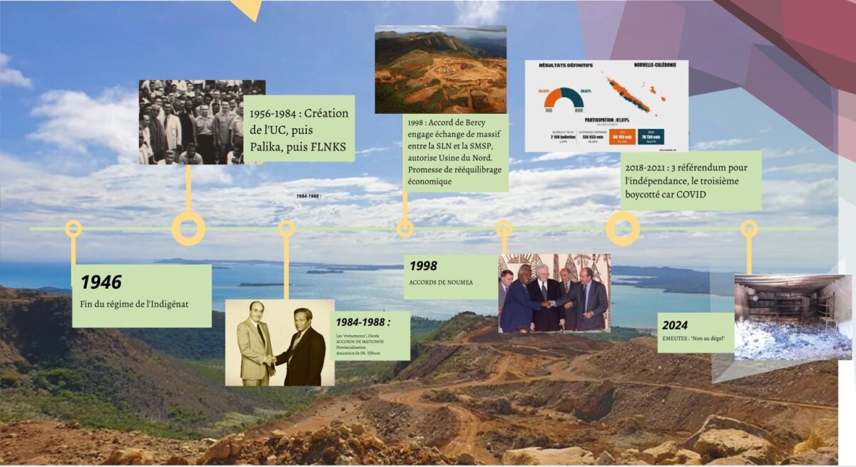 L’année 1946 signe la fin du régime de l’indigénat (Figure 2) mais également le début d’une deuxième phase de colonisation à travers la création de l’Institut Français d’Océanie. Les géologues viennent sur place afin de comprendre la présence du nickel et les processus géologiques à l’origine de la formation de l’île. La période entre 1956 à 1984 (Figure 2) est assez politique et est marquée par une montée de mouvements indépendantistes kanaks, ce qui a mené à la création de partis politiques indépendantistes (UC, Palika et KLNKS). En 1998, les accords de Bercy (Figure 2) autorisent un échange entre deux massifs miniers appartenant à la SLN et la SMSP. Cette dernière est implantée en Province Nord, et l’accord a pour objectif le rééquilibrage économique entre la Province Sud, très développée, et les deux autres (Province Nord et Province des iles Loyauté). Entre 2018 et 2021 (Figure 2), une série de référendum est organisée afin de statuer sur l’indépendance de la Nouvelle-Calédonie. Le troisième scrutin est boycotté par le parti des indépendantistes, pendant la période COVID. En 2024 (Figure 2), des émeutes éclatent suite à un sentiment de trahison des accords de Nouméa, provoqué par le dégel du corps électoral. Une des conséquences (parmi beaucoup d’autres) est qu’une lithothèque a été incendiée, entraînant hélas la destruction irrémédiable d’échantillons et de cartes géologiques des fonds marins.