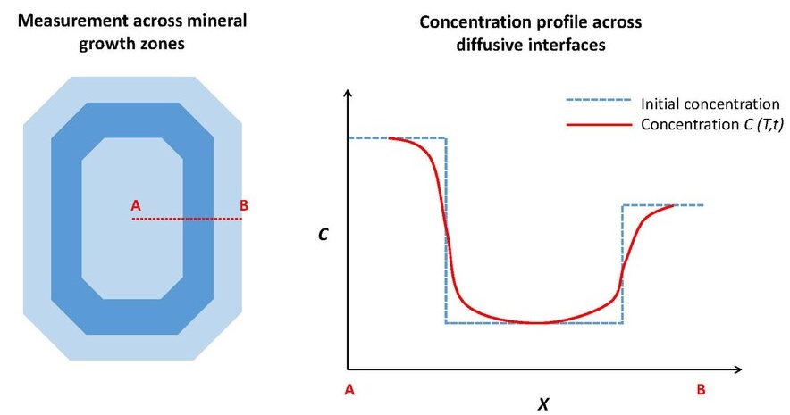 En effet, plus longtemps un cristal restera à haute température à évoluer, typiquement dans les chambres magmatiques, plus les cristaux zonés vont se diffuser dans la structure. En regardant la prévalence des éléments le long d’un profil on obtient alors une figure passant d’un changement brusque à une pente plus douce (Figure 1).