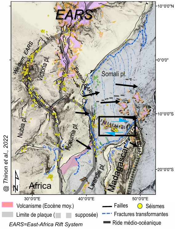 Vient alors le temps des questions en suspens concernant cet évènement magmatique exceptionnel, notamment sur les types de volcanisme et les processus en cours, la « plomberie magmatique », le contexte géodynamique et géologique régional et local, les évènements comparables éventuels dans le passé, et les aléas et risques associés. Avant cette crise, il y avait peu de données précises disponibles sur cette zone de l’archipel des Comores, dont la nature volcanique était connue mais faisait l’objet de débats controversés sur ses liens avec les systèmes de rift voisins (rift Est-Africain à l’Ouest, Rift Malagasy (Madagascar) à l’Est) et sur les modes et la distribution des déformations existant sur cette limite diffuse entre les plaques lithosphériques Lwandle et Somalie, correspondant à un grand décrochement dextre (voir flèches bleues dans l’encadré noir, Figure 1 ci-contre, extraite de Thinon et al., 2022).