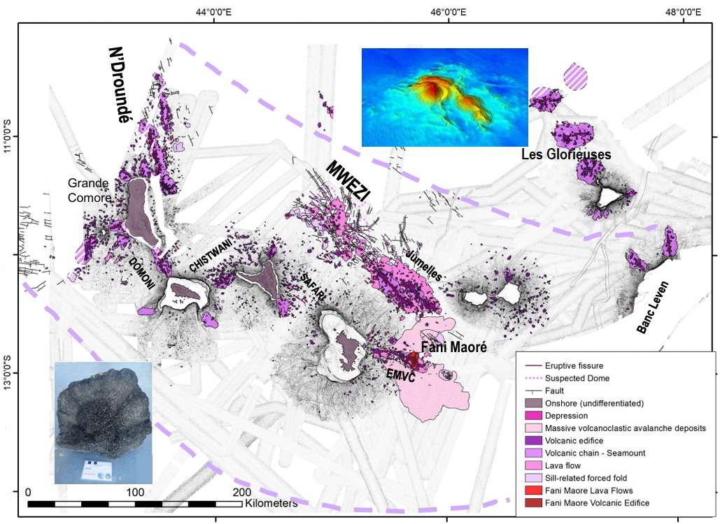 Grâce aux nouvelles données acquises sur tout l’archipel (campagnes SISMAOR, SCRATCH, GEOFLAMME, MAYOBS et levés SHOM), des compilations bathymétriques ont été réalisées, révélant deux grandes provinces volcaniques, Mwezi et N’Droundé (Figure 2), s’étendant sur ~4000 et 6000 km2, avec plus de 2400 édifices volcaniques de taille comparable ou inférieure à celle du Fani Maoré, ~3000 km2 de coulées de laves, ~1000 km2 de plis forcés de sills magmatiques et de nombreuses fissures éruptives, failles et grabens. C’est donc un système volcanique de 700 km de long et plus de 200 km de large, qui correspond typiquement à une limite de plaque immature (en cours de formation).