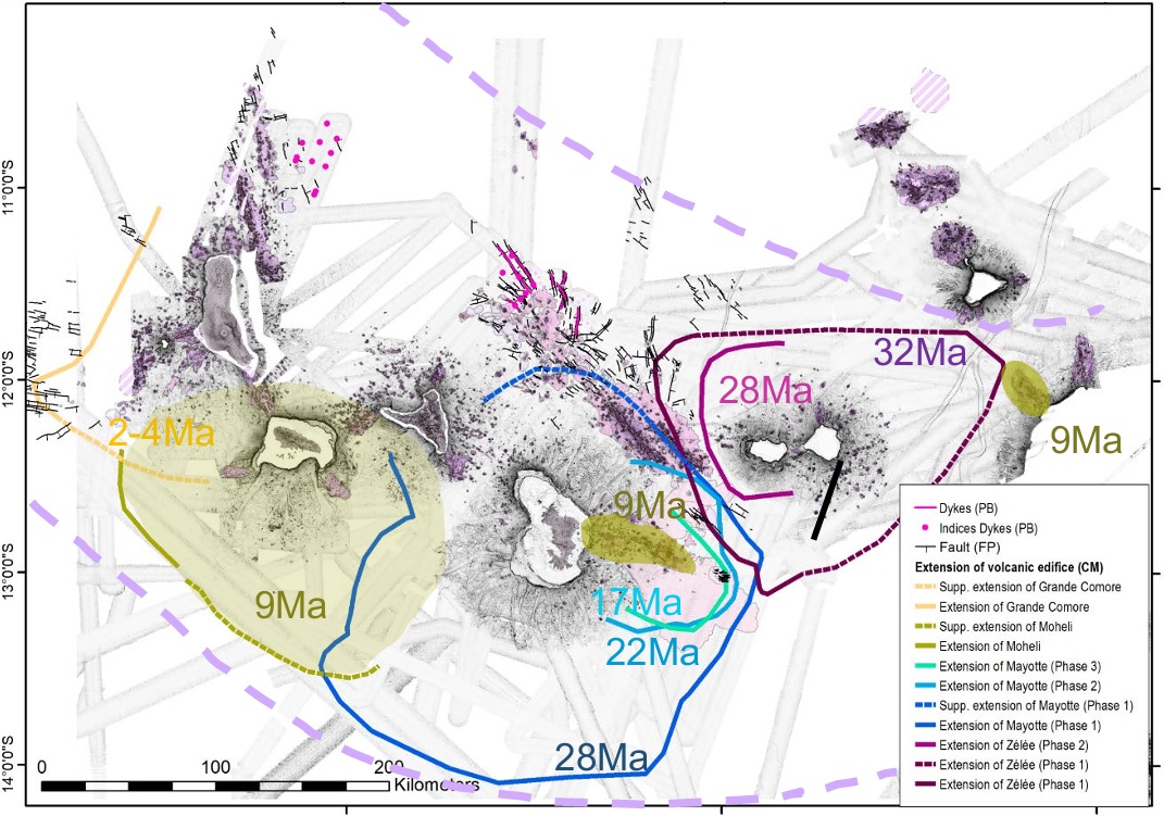 Figure 3. Extension des édifices volcaniques majeurs dans le canal du Mozambique, avec les âges du début de leur formation. Teintes bleues: Mayotte; jaunes: Grande Comore; vertes: Moheli; violettes: Zélée). Modifié d’après Masquelet et al. (2025).