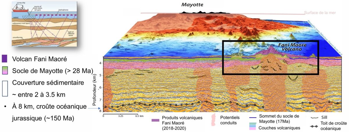 La Figure 4 représente l’ensemble des structures imagées sous Mayotte par une vue en perspective depuis la surface jusqu’à plus de 8 km de profondeur, mettant en évidence l’édifice volcanique Fani Maoré en fond de mer (en violet), mais aussi :