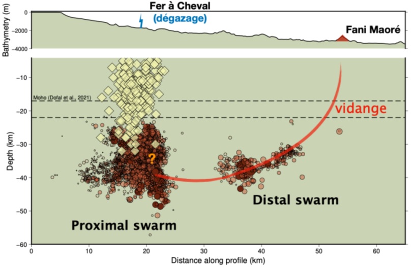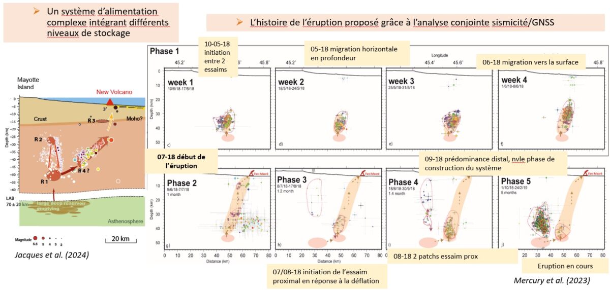 Figure 1. L’histoire de l’éruption et du système magmatique complexe révélés par la complémentarité de différentes observations (sismologiques et géodésiques). D’après Mercury et al. (2023) et Jacques et al. (2024).