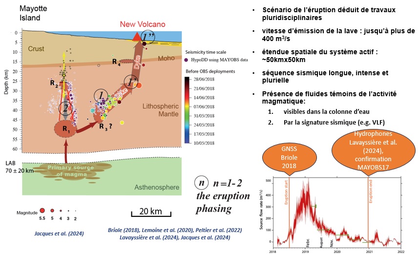 Figure 4. Résumé du scénario éruptif proposé déduit de travaux interdisciplinaires (Briole, 2018; Lemoine et al., 2020; Lavayssière et al., 2024; Jacques et al., 2024). A gauche: phases 1 (incluant 3 étapes) et 2 illustrées sur une coupe à l’échelle de la lithosphère, à l’est de l’île de Mayotte. A droite: principales caractéristiques de la crise sismo-volcanique, avec une estimation des taux d’émission de magma de 2018 à 2022.