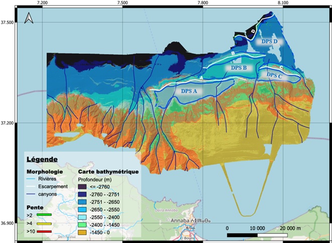 Figure 5. Carte de bathymétrie classifiée de la marge d’Annaba, montrant des surfaces perchées (DPS A, B, C, D) en pied de pente, en large recouvrement, formant des bassins perchés bordés au nord par des failles aveugles à pendage sud (A, B, C, D).