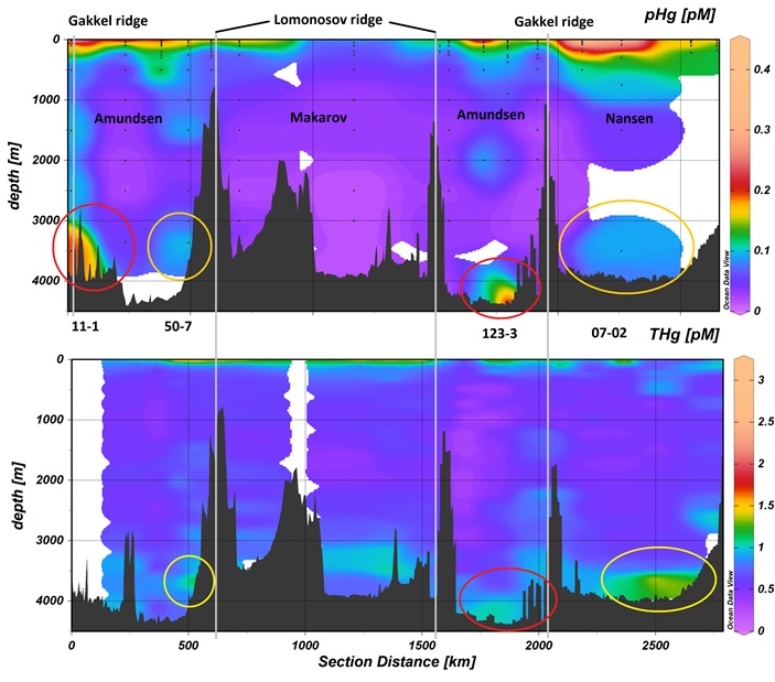 Figure 4. Concentrations en mercure particulaire (pHg) (haut) et total (bas) sur un transect dans l’océan Arctique central (2024 en haut, 2015 en bas). Les ellipses sont les sites sous influence de l’activité hydrothermale (rouge) ou de remises en suspension (jaune).