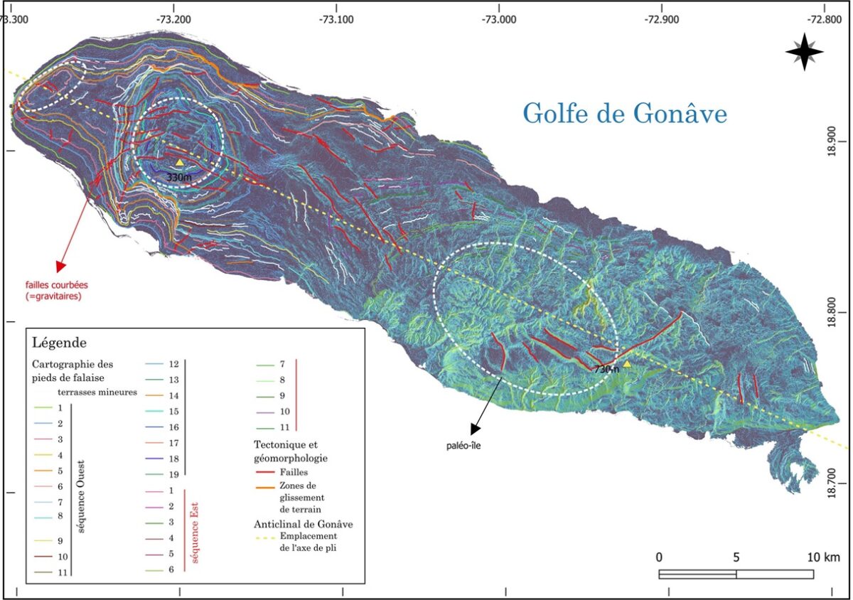 Figure 3. Séquences de terrasses marines identifiées par LIDAR sur l’île de Gonave. Les ellipses en tiretés blancs indiquent les paléo-îles.