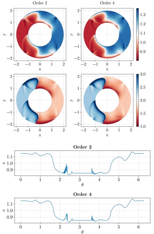 Des tests de convergence des modèles au second et quatrième ordre sont ensuite présentés pour différentes tailles de grilles, permettant de comparer la solution théorique et les résultats du modèle. Taran montre alors deux exemples d’application de l’approche: (1) une comparaison d’une expérience de plateau en 1D, en 2D au deuxième ordre et en 2D au quatrième ordre avec sa solution spectrale, et (2) une expérience de rupture de barrage (Figure 2). Dans les deux cas, le passage au 4ème ordre semble être avantageux en diminuant le bruit sans augmenter considérablement le temps de calcul. Ceci rassure donc le public sur le bien-fondé de l’approche.