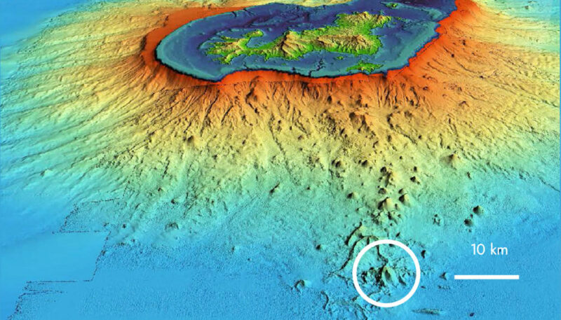Un an après le début des événements sismiques, une première campagne océanographique, nommée MAYOBS1, est lancée. Cette campagne rassemble des scientifiques du CNRS-INSU, du BRGM, de l’IFREMER, de l’IPGP, etc…. Les chercheurs comparent alors les nouvelles données bathymétriques aux relevés du SHOM, datant de 2014 (réalisés lors d’un rapide transit). Et là, c’est la surprise : une nouvelle structure sous-marine est apparue ! Devant les yeux ébahis des scientifiques à bord, se dévoile un volcan flambant neuf. Un nouvel édifice volcanique est découvert à l’est de Mayotte, dont le cône, de 800 mètres de haut, repose à 3500 m de profondeur, et est ornée d’impressionnantes coulées volcaniques s’étalant sur 16 km en Nord-Sud et 8 km en Est-Ouest, situées à environ 50 km de Mayotte : le Fani Maoré (Figure 2).