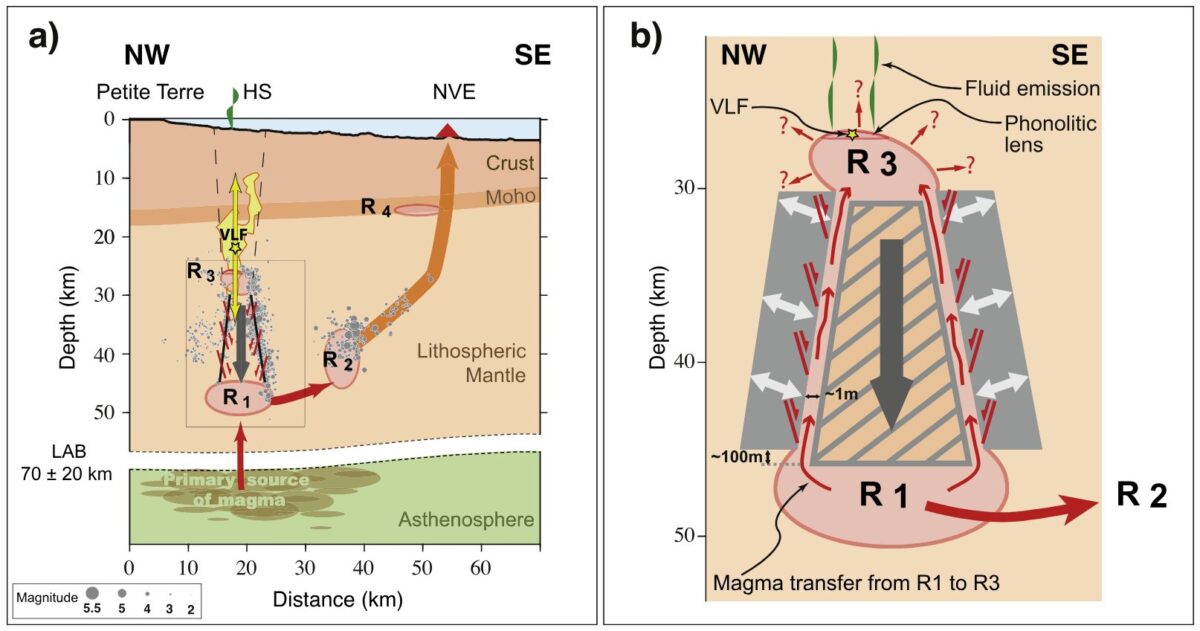 Figure 3. Coupes schématiques verticales à 2 échelles montrant le lien magmatique entre les essaims, le fonctionnement du piston et ses effets sur les réservoirs (Jacques et al, 2024). La flèche noire indique le mouvement descendant du piston, estimé à 100 m environ. Les doubles flèches blanches sur la coupe (b) indiquent les directions d’extension déduites de l’analyse des mécanismes au foyer. VLF = séismes de très basse fréquence enregistrés durant la crise sismo-volcanique.