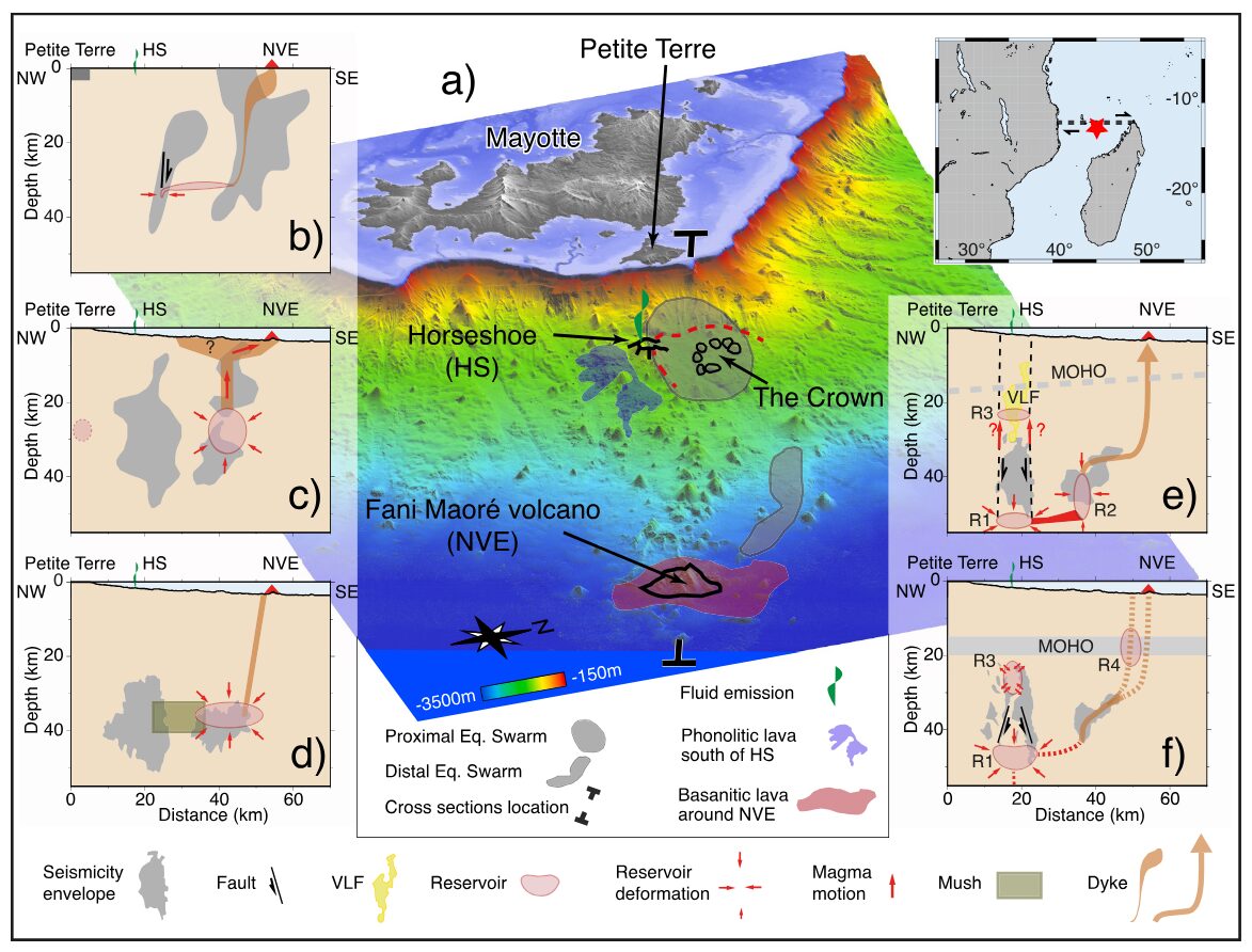 L’éruption du nouveau volcan Fani Maore sur une vieille lithosphère océanique (150-155 Ma) au large de Mayotte est l’une des plus grande jamais documentée en domaine marin. Eric Jacques, chercheur à l’IPGP (Institut du Globe de Paris) et collaborateur.ices, ont travaillé.e.s à travers une approche multidisciplinaire, dans l’objectif de déterminer la structure 3D volcano-tectonique révélée par les enregistrements sismologiques au large de Mayotte. Ces données, acquises par des OBS (Ocean Bottom Seismometers) déployés lors des missions MAYOBS 1, 2, 3–4, 6, 7 et 8, révèlent une profondeur associée aux séismes entre 20 et 55 km de profondeur, soit, dans le manteau lithosphérique (Feuillet et al, 2021), ce qui est très inhabituel. La période étudiée, de février 2019 à novembre 2019, se situe après le maximum d’activité mais avec des flux de magma encore significatifs.