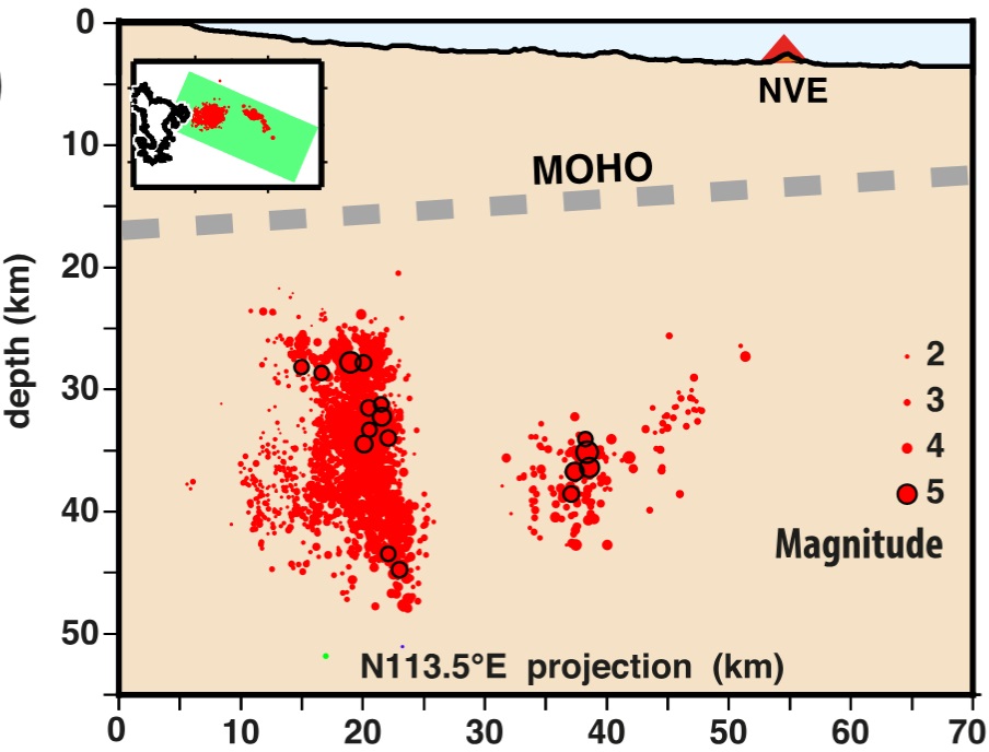 La distribution des séismes de la zone proximale dévoile une structure plus complexe composée d’une partie ovoïde supérieure entre 25 et 30 km de profondeur et une autre structure conique entre 30 et 45 km de profondeur.