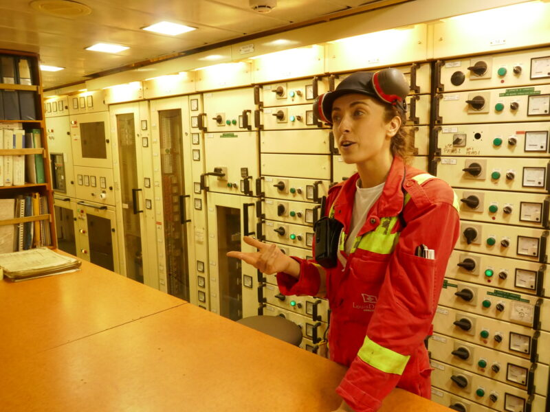Nous commençons notre visite des machines par le PC machine, aussi appelé DA. Dans cette pièce, une des seules climatisées des machines, Carla, la troisième mécanicienne du Marion Dufresne, nous équipe de casques anti-bruits. En effet la quantité de machineries nécessaires pour le fonctionnement d’un navire de cette taille produit un certain volume sonore. Nous sommes aussi tous.tes équipé.e.s de chaussures de sécurité, de casques et autres EPI nécessaires pour se promener dans des couloirs parfois exigus et bas de plafond.