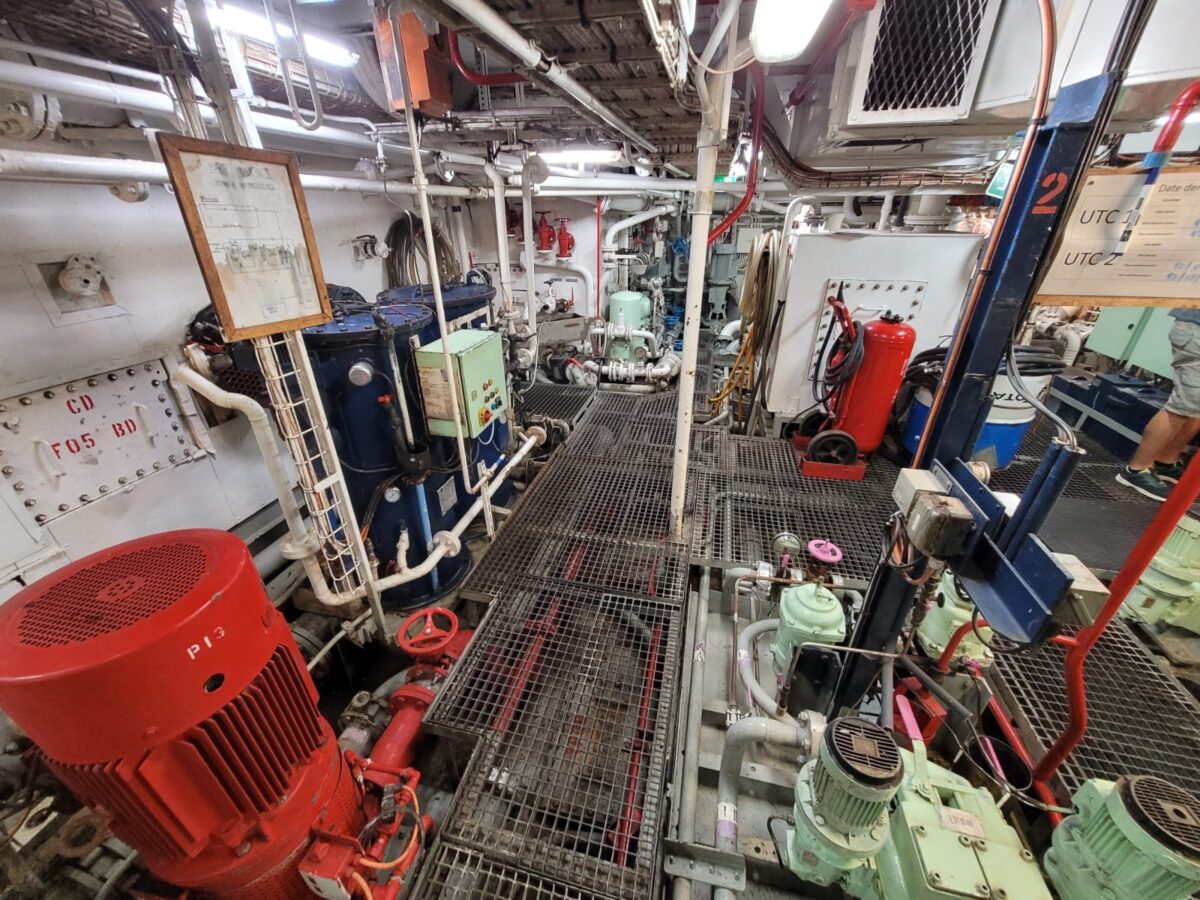 Nous commençons notre visite des machines par le PC machine, aussi appelé DA. Dans cette pièce, une des seules climatisées des machines, Carla, la troisième mécanicienne du Marion Dufresne, nous équipe de casques anti-bruits. En effet la quantité de machineries nécessaires pour le fonctionnement d’un navire de cette taille produit un certain volume sonore. Nous sommes aussi tous.tes équipé.e.s de chaussures de sécurité, de casques et autres EPI nécessaires pour se promener dans des couloirs parfois exigus et bas de plafond.