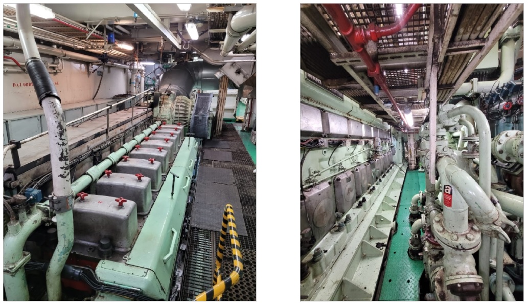 L’ensemble de la production énergétique du bateau est électrique. Trois groupes électrogènes (deux 8-cylindres et un 6-cylindres) consomment le carburant et alimentent les deux moteurs électriques principaux à l’origine de la propulsion du navire. L’alimentation électrique des moteurs permet une plus grande précision dans la puissance et un meilleur rendement de consommation. En effet, un seul groupe (Figure 1) tourne en transit, à environ 80% de sa puissance, ce qui permet d’atteindre une vitesse de croisière de l’ordre de 10 noeuds.