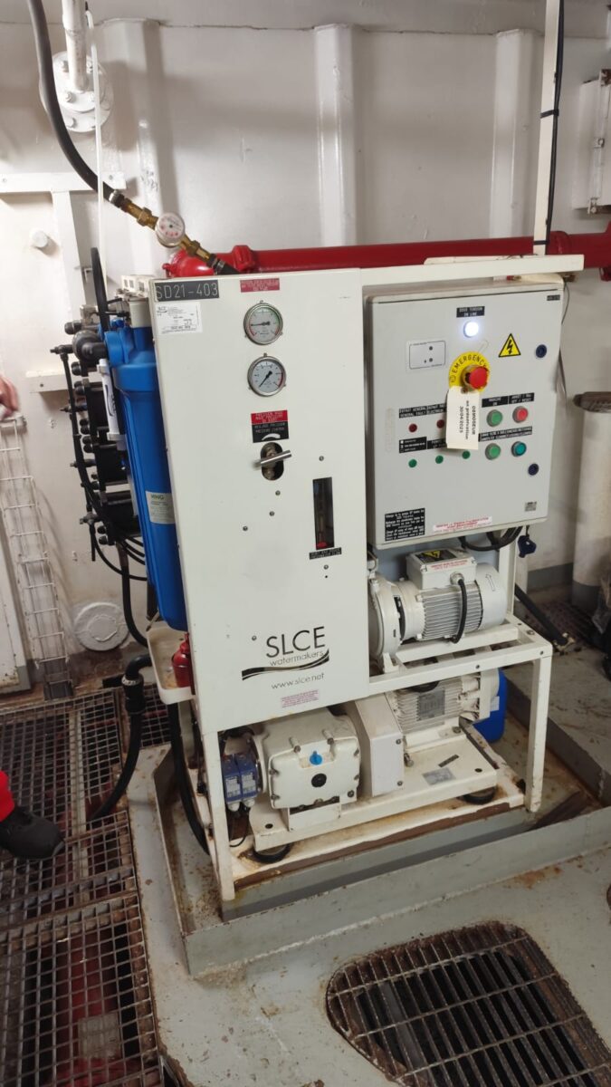 La gestion de l’eau sur le bateau se partage en plusieurs systèmes. D’abord, l’eau usée dite « eau noire » est rejetée après passage par la station d’épuration à bord. Les eaux grises quant à elles, sont filtrées et jetées directement. Ensuite le bateau est équipé d’une station de désalinisation d’eau de mer par osmose inverse, ce qui lui permet de créer sa propre eau potable. Le principe de cette machine repose sur la filtration: l’eau est filtrée puis est mise dans un milieu à de très forte pressions afin de la forcer a traverser un filtre très fin qui retient l’ensemble des impuretés et de tout autre ion. Cette eau doit donc ensuite être re-minéralisée afin d’être consommée (Figure 3). L’eau distillée peut ensuite servir au refroidissement des machines.
